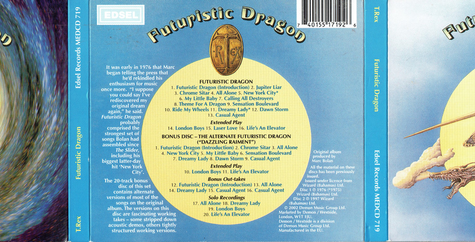 T.Rex’s Futuristic Dragon was released as a 2-CD set album in the UK by Edsel Records (catalog number EDCD 551) on January 30, 2002, comprising Futuristic Dragon (Extended Play) and The Alternative Futuristic Dragon ("Dazzling Raiment"), both previously available individually.