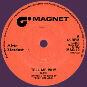 Alvin Stardust’s “Tell Me Why” 7-inch vinyl single, was released in the UK on November 15, 1974, on Magnet Records (catalogue: MAG 19). Backed with “Roadie Roll On,” this emotive glam ballad (A) and upbeat rocker (B), both composed/produced by Peter Shelley (B co-written with Stardust), peaked at No. 16 on the UK Singles Chart for 8 weeks. Pressed with solid centre, push-out centre, and promo (large A, release date) variants, it’s a poignant ‘70s Stardust staple.
