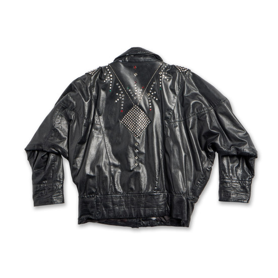 • Custom black leather jacket with crystal embellishments