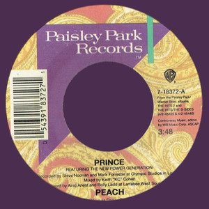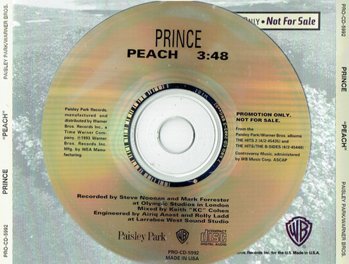 Recorded at Paisley Park Studios & Olympic Studios. Engineered at Larrabee West. “Peach” was a playful funk-rock track with the famous line “You’re a peach!”; the B-side live “Nothing Compares 2 U” (later a Sinead O’Connor hit). Released to promote The Hits/The B-Sides collection during the symbol era.