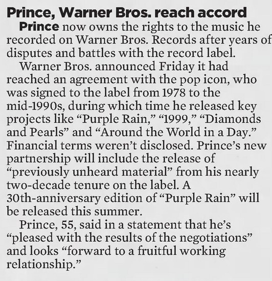 📰 Prince & Warner Bros. Agreement – News Item – Apr. 2014