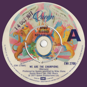 Queen’s “We Are The Champions” 7-inch vinyl single, was released in the UK on October 14, 1977, on EMI Records (catalogue: EMI 2708). Backed with “We Will Rock You".