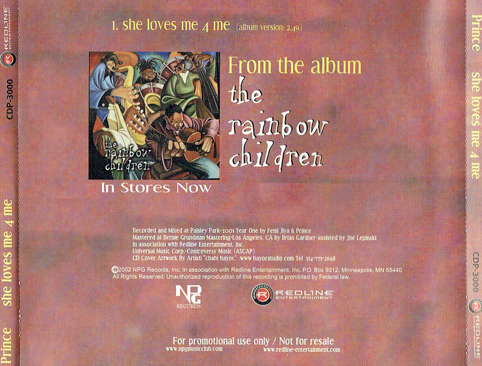 She Loves Me 4 Me was released on December 10, 2001 as a free digital download through Prince’s official Rainbow Children website, rainbowchildren.com. Arriving just weeks after the album’s release, the track served as a rare early‑2000s digital giveaway, reinforcing Prince’s growing interest in online distribution and direct fan engagement.
