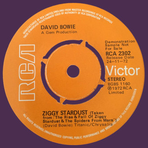 More stardust moments added weekly.Backed with “Ziggy Stardust,” this Yardbirds-inspired R&B riff monster — co-produced by Ken Scott, inspired by Iggy Pop with a Jean Genet pun — peaked at No. 2 on the UK Singles Chart for 13 weeks (blocked by Little Jimmy Osmond). Pressed by CBS Aston Clinton with knockout/solid centre, black/yellow labels, and promo variants, it’s a glam-rock cornerstone.
